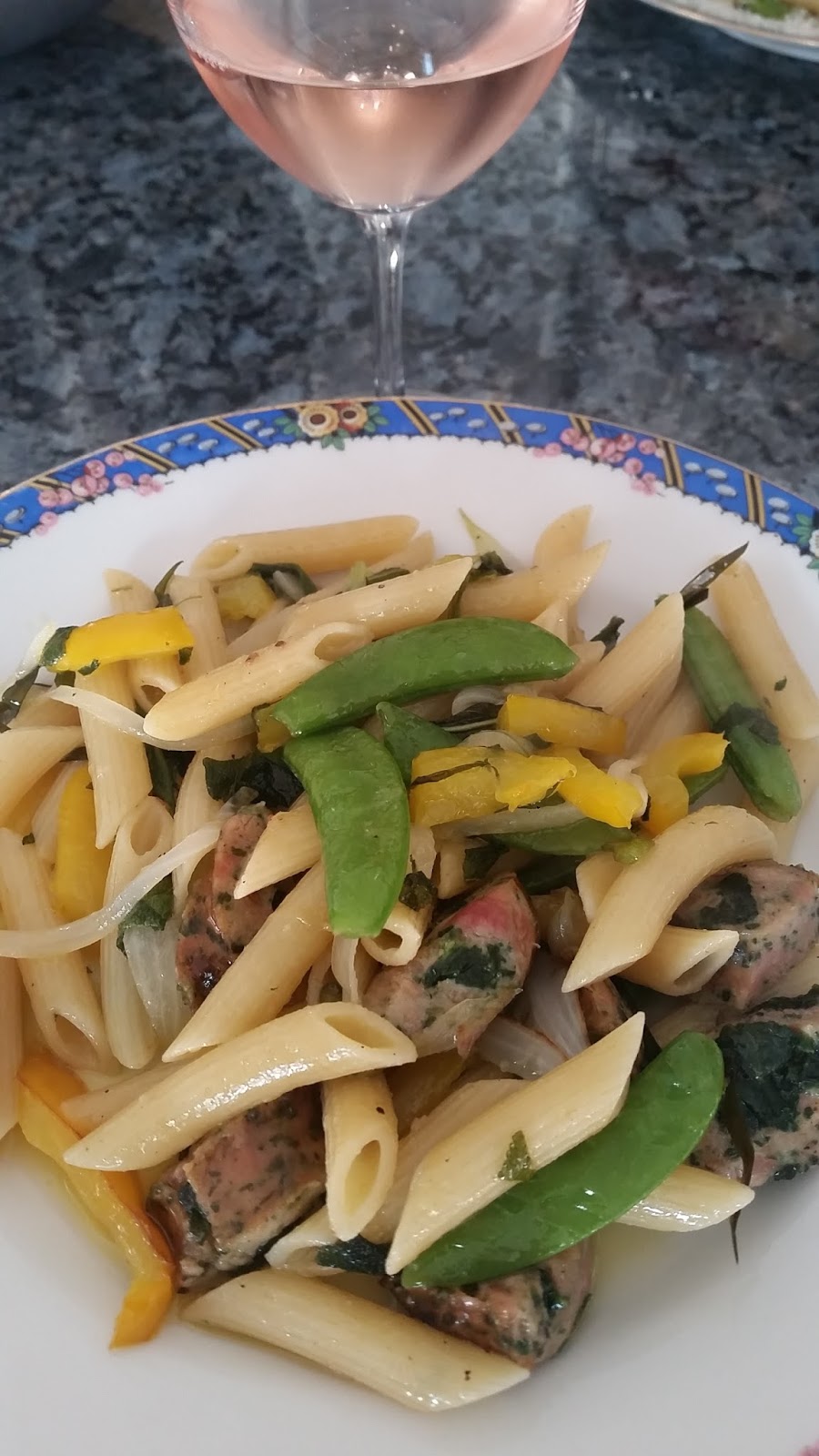 Dinner for the evening was chicken sausage sauteed with sugar snap pees, onions some oil and garlic. Pairing, perfect!