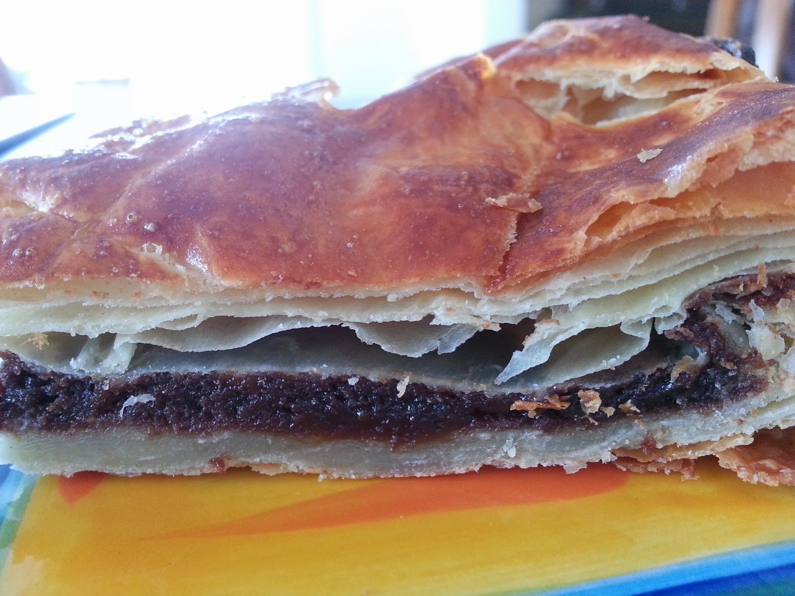 Preheat oven to 425 degrees F. In a bowl, ix together the Nutella, 2 eggs and ground hazelnuts. Unroll the first sheet of puff pastry onto a baking sheet covered with parchment paper. Carefully spread the pastry with a layer of Nutella mixture. Leave 3/8″ border for joint the two sheets of pastry together more easily. Unroll the second sheet of pastry and lay it on the first. Join the edges of the two sheets of pastry, pressing them together all around. Brush the whole surface of the galette with egg yolk then use the point of a knife to decorate it with a large criss-cross pattern. Bake for 25 minutes