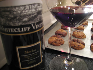 It’s that time of the year again where the annual cookie swap comes into play.  With less than one week notice I had to make 8 dozen cookies for our “Wine Night” swap.  So Friday evening found me slaving over my oven and kitchen aid to bake my cookies.  I couldn’t do it alone, so I pulled out a 2008 Whitecliff Vineyards New York State Merlot.