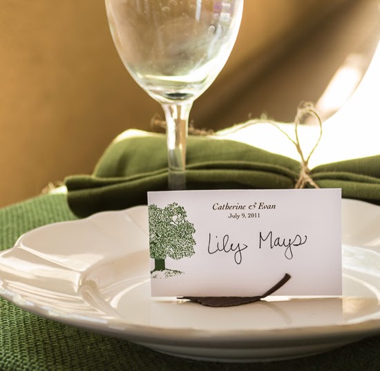 If you are planning a vineyard or wine-themed wedding, choose one motif – or several – that you love, such as vines, grapes, a monogram of your initials or another symbol that is a match for your theme, style and taste. For our example, we’ve chosen an oak tree: an unexpected and romantic symbol that is a great match for a vineyard ceremony and reception.