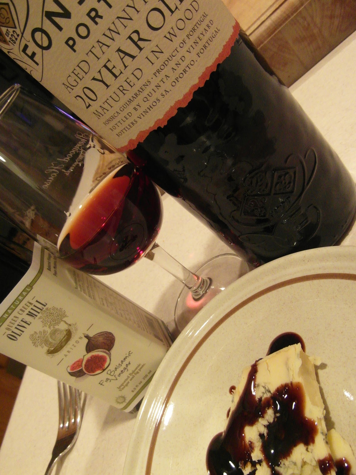 What pairing goes good with Port, a nice Stilton Blue Cheese which I happen to have in the fridge. I took that out and drizzled some fig balsamic vinegar on it. Wow a very nice pairing. The cheese and balsamic neutralized the alcohol in the port and made the mouth feel creamier.