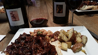 The 2014 Angels’ Share and 2015 Sexy Beast I served with pulled pork, roasted potatoes and a really good cranberry bean and bacon ragout. I found the Angels’ Share to be a bit more complex than the Gnarly Dudes. Aged in oak for 12 months seeing 6% new French oak and the rest aged in oak one to six years old. With a very purple color, Angels’ Share had notes of dark berry, mocha and clove. Black cherry and blueberry on the palate with nicely integrated tannins. Mid palate shows hints of soft licorice and black pepper. As the wine opens it becomes smoother with chocolate and black pepper on the finish. The pepper just dances on the tip of your tongue. Paired with the pork it creates its own flavor and brings out the spice in the wine without it being overly powerful.