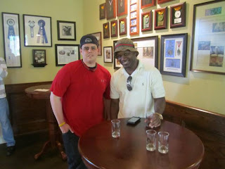 It is worth noting that Eggleston happens to be sporting one of the finer chapeaus in the room, a stylish Burberry number perched rakishly atop his head. He sips the Brown Ale with pal Nick McCullough of Greenwich.