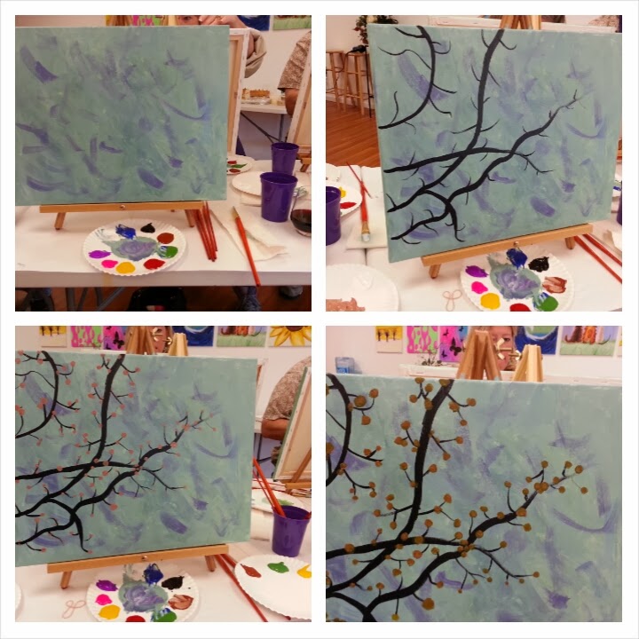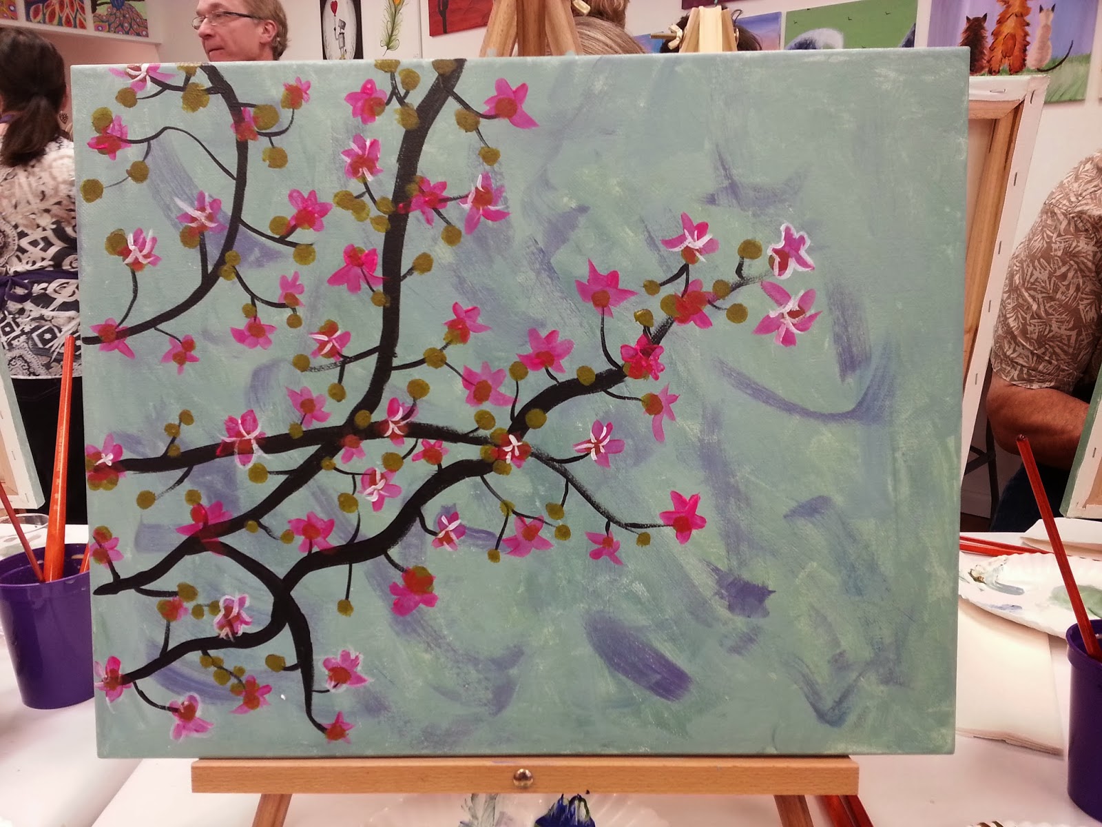 Then the instructions came. I can do this I said. First instruction was to mix the paint for the background and paint the canvas. Ok, how hard can that be. Well…I didn’t mix enough first and when I mixed again, it wasn’t the same shade, but that was okay. Then we were instructed to draw three black lines with the one brush. Done. Then with the smaller brush, add limbs. Ok, this is now beginning to take some shape. Then the leaves came on then the flowers. There was no shortage of wine either as someone was always walking by making sure you had enough in your glass and to see if you needed any assistance.