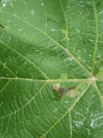 I was recently at a local vineyard and was walking by the vines and noticed they had powdery mildew. If you look closely at the picture, you see the white on the green leaves. Yup..that’s a case of powdery mildew. Powdery mildew shows itself on the top surface of the leaves.