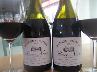 This is the tale of two Baco Noirs that I’ve been hording in my wine cellar for a vertical tasting.  Both the 2009 and 2010 Baco’s are produced by Hudson-Chatham Winery in Ghent, NY and made from Old Vine Baco at the Masson Place Vineyard, Pulteney Farm in the Finger Lakes.