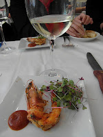 When we sat down for lunch it was more like a dinner.  Five courses all paired with a wine.  The Trumpeter Torrontes was paired with Langostino Encendido which was a grilled spicy prawn and homemade peach chutney.