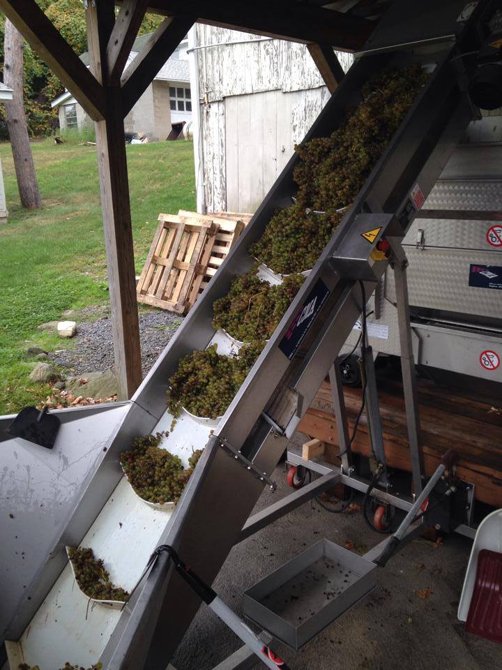 We drive thru the rows and dump the grapes into the larger one ton bins. These get taken right to the winery where we get them all together. Then we take our tractor with forks on it and strap a bin to it. Drive up to the elevator that has a bin at the bottom and tip the bin. 2 of us then use a hoe and gently slide the grapes into the bin. They go up the elevator to the crusher/de-stemmer where the grapes are beaten off the stems and go into a crusher where just the skins are broken. Then, if they are red grapes they are pumped into the winery and into more one ton bins to be fermented. If they are white grapes they go directly to the crusher. When it is full, it is started up and the juice goes right into a tank to be fermented. That takes about an hour and a half per batch. Pressed, rotated, pressed, etc. The balloon inside inflates and pressed the grapes against the drum with holes in it to get the juice. But, you cannot press to hard or you get a bitter taste from the seeds. Luckily the machine knows what it is doing and we just have to wait. The juice is then given a recipe of additives to help fermentation by the winemaker all depending on how much juice is in each container. A special yeast for whites and reds, honey wine and cider are used. If I tell you the recipe, I would have to shoot you! Just kidding. It is my Husband Joe’s job and we just lug the buckets and stir the bins. Twice a day the grapes are then pressed down and turned over as they ferment so the color comes out of the red grapes and they ferment evenly. It is a hard job to do this by hand, but worth it in the end. We check the sugar every day to see if the yeast has eaten it all and the fermentation is over. When it gets to zero sugar, we press the grapes. The wine (since once fermentation is over, it is officially wine) is then checked to see if it has enough SO2 to keep it from spoiling, and left to rest for 2-3 months. We check the S02 monthly to make sure it is stable, but the wine needs to settle out to get it to clear. We then “rack” the wine – siphon off the top to get clear wine into another tank, and dispose of the sludge at the bottom (which is a lovely shade of magenta by the way) back into the fields. We also spread the stems and waste from crushing back into the fields. Then, the good wine is tested for S02 and left to mature. We usually wait almost a year for reds to bottle them, and about 6 months for whites. We do “bench trials” to see what the wine tastes like and if we need to add anything