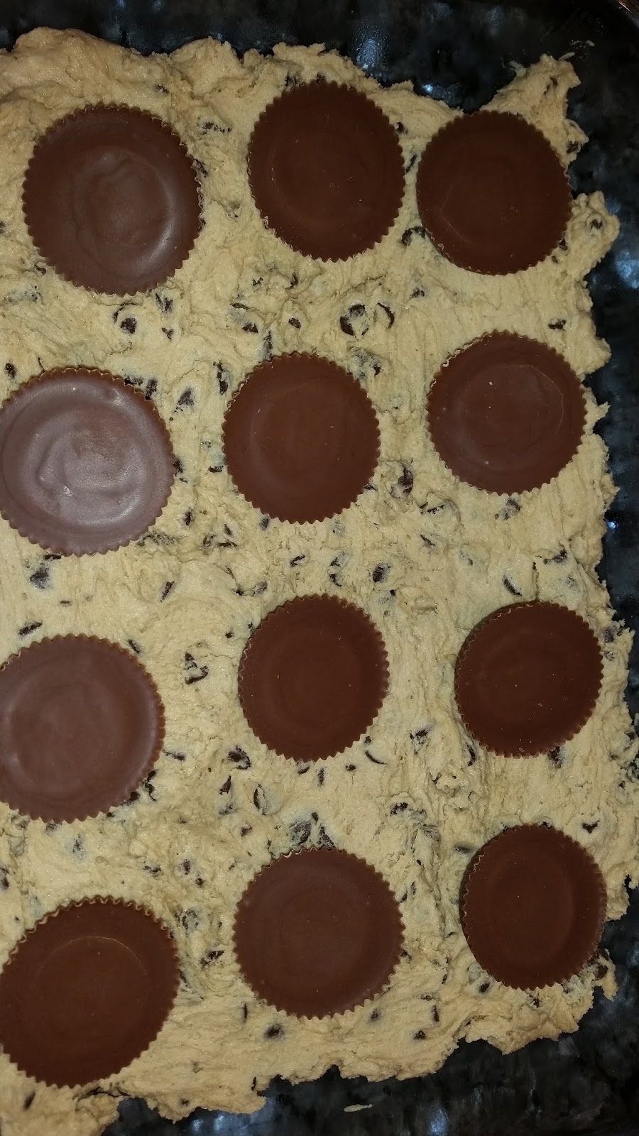 Grease a 13 x 9 baking pan. Start with the Toll House Chocolate Chip Cookie recipe. Once you make that line the bottom of the pan with it. Next put those Reese’s on top. You can do this with just about any candy that goes with chocolate.